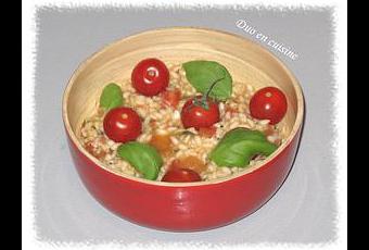 Quand le riz devient translucide, ajouter une louche de bouillon et les morceaux de tomate, 6-7 feuilles de basilic ciselées. Saler légèrement et poivrer. Mélanger.