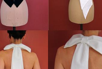 Le weekend dernier, c'était l'anniversaire de mariage d'une amie. Je connais ses goûts en mode, un chic toujours intemporel, une élégance simple. J'ai donc pensé à confectionner ce petit haut, en fait un gilet d'homme où j'ai supprimé le dos pour en faire un dos nu. J'ai cousu dans le dos un gros nœud en organdi blanc qui devait appartenir à une vieille robe de communiante et et fermé le dos au niveau de la taille avec des galons de dentelle élastique montés les unes aux autres pour obtenir une certaine hauteur.