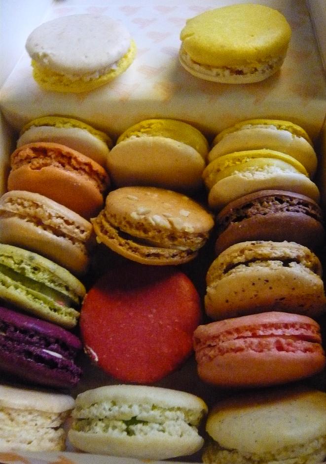 Moi, hier soir, je me suis soignée le moral (chaussettesque) avec un somptueux macaron abricot et l'humeur (groumpfique voire massacrante) grâce à un sensationnel macaron menthe-fraise (avec, je crois, une pointe de basilic). Mon seul regret était que le parfum carotte soit en rupture de stock car j'étais vraiment en déficit grave de réserves d'amabilité ! Afin de consolider mon état, j'ai poursuivi le traitement cet après-midi avec des petits formats de la même provenance (je répète : Foucher avenue de l'Opéra) aux parfums myrtille, noix de coco-citron vert, bergamote et menthe fraise again (quand on aime, on ne compte pas).