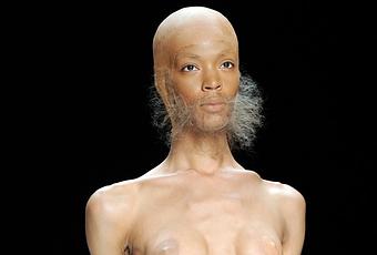 Ah! Ca faisait longtemps tiens. Le porte-manteau du jour a eu la chance d'arborer une perruque en peau de fesse, des rouflaquettes neurasthéniques, tout en ayant reçu un quintal de fond de teint sur son 80A pour masquer deux tétons impudents. Porte-manteau, un bien beau métier. Photo prise lors de la fashion week à Berlin.