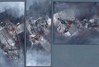 fond anthracite et argent avec incrustatuion de reliefs en papier mâché et petits objets en inox , pour finir avec une petite touche de rouge