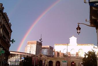 Après la pluie, un superbe arc-en-ciel s'est formé et la ville s'est métamorphosée: une lumière un peu surnaturelle a éclairé le bitume mouillé.