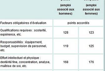 «C’est le nombre total de points accordés aux quatre facteurs qui permet de reconnaître l’équivalence entre les emplois dans une entreprise.» La Loi ne dit pas comment on peut mesurer ces facteurs afin de leur attribuer des points de manière objective, mais elle le suggère, de même que le tableau suivant, qui est tiré du texte de la Loi :