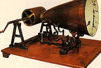 Après des premiers essais réussis d'enregistrements effectués en 1853 et 1854, Scott de Martinville dépose le 25 mars 1857 le brevet du phonautographe, appareil qui enregistre le son sans toutefois pouvoir le restituer. Le dispositif se compose d'un pavillon relié à un diaphragme qui recueille les vibrations acoustiques, celles-ci étant transmises à un stylet qui les grave sur une feuille de papier enroulée autour d'un cylindre rotatif et enduite de noir de fumée.
