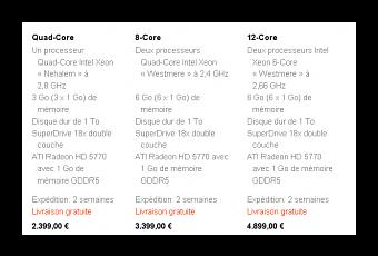 Rappelons que ces nouveaux Mac Pro ont été revus à la hausse, offrant jusqu’à 12 cœurs de puissance de calcul (à partir des Quad-Core et 6-Core Intel Xeon) pour une performance 50% plus rapide que la génération précédente. La nouvelle carte graphique ATI Radeon HD 5770 à 1 Go de mémoire est proposé en configuration de base, et en option nous avons droit à la Radeon HD 5870. Les prix sont :