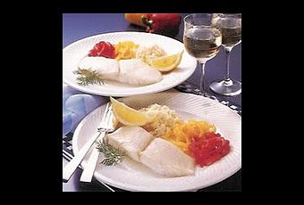- Égoutter les tronçons de barbue ; retire la peau et les arêtes. Les poser sur des assiettes chaudes ainsi que les poivron, l'aneth et les quartiers de citron. Arroser de vinaigrette et servir aussitôt.