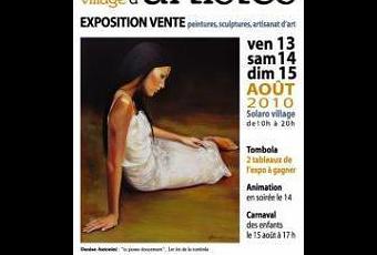 C'est la 19ième édition de la manifestation artistique de 3 jours organisée par l'association U Sulaghju et la municipalité de Solaro.Exposition-vente de peintures, sculptures, artisanat d'art, la Mairie de Solaro village en présence de nombreux artistes.De 10h à 20h.- Tombola : deux tableaux de l'exposition à gagner, dont celui de l'affiche, oeuvre de Denise Antonini.- Animation en soirée le 14 août.- Carnaval des enfants le 15 août.