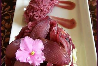 L'ingrédient manquant, c'est la pomme de terre vitelotte, qui aurait donné un total look purple à mon plat. Mais j'aime bien le contraste de la pomme de terre classique et du confit, qui fait ressortir la belle couleur lie-de-vin des oignons.
