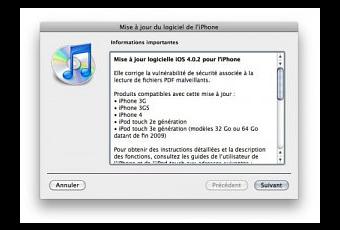 EDIT 21h00 : Apple propose la mise à jour de l’iPhone en 4.0.2. Cela « corrige la vulnérabilité de sécurité associé à la lecture de fichiers PDF malveillants.