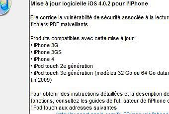 La principale annonce, c’est bien sûr la correction de la faille de sécurité qui est exploitée depuis quelques semaines pour opérer le jailbreak de l’iPhone 3G, 3GS ou iPhone 4, mais aussi des dernières générations d’iPod Touch. Pratique pour tous les amateurs de jailbreak, cette vulnérabilité était également susceptible de permettre une attaque malveillante en direction de l’iPhone par le biais de fichiers PDF spécialement conçus et il était logique qu’Apple la comble, d’autant que l’affaire a déjà obtenu un certain relais médiatique.