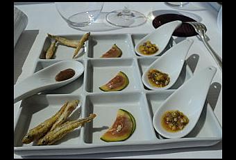 Voici quelques photos prises lors de notre repas. Dans cette mise en bouche, on retrouve au milieu un ravioli fait avec une trache ultra fine de courgette.