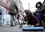 Une SDF et son chien dans une rue de St Petersbourg, Russie, le 19 décembre 2007.