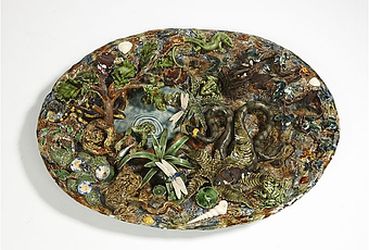 A voir chez Camard & Associés, cet important plat à décor naturaliste figurant des batraciens : salamandre, grenouilles, crapaud ; des reptiles : lézard, serpent ; des insectes : papillons, scarabée, libellules; sur fond de végétation et de flore aquatique, en faïence émaillée polychrome. Verso jaspé. Non signé. Petits accidents.