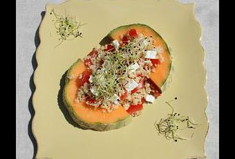 * Mélanger les tomates avec le boulgour, et verser le tout au milieu des 2 morceaux de melon.