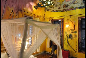 et entrez. Vous voici dans la célèbre “chambre de l’explorateur”. C’est l’artiste plasticienne, férue de pataphysique, Myriam Merch, d’origine belge, mais dont le coeur bat depuis plusieurs décennies à Madagascar, qui l’a entièrement imaginée, décorée, travaillée, du sol au plafond, des murs aux fenêtres, du ciel de lit aux toilettes qu’un Hundertwasser n’eût pas manqué d’apprécier.