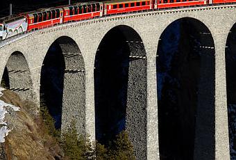 RhB Ge 4 / 4 III avec un train Regio Express de St. Moritz à Coire sur le viaduc de Landwasser