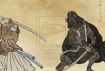 D'un combat de sabre à l'autre, Arthur Parreira choisit d'intégrer Dart Vador dans une illustration inspirée du style des estampes japonaises.