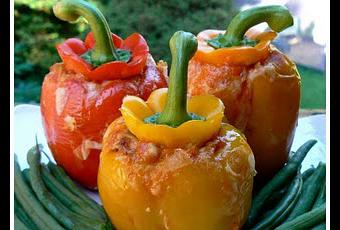Prendre les poivrons et les blanchir dans de l’eau additionnée de sel, durant 5 minutes. Entre temps, dans une grande poêlonne, cuire la viande, la saucisses italienne avec les oignons, l'ail et épices. Ajoutez la crème de tomate et le riz, bien brasser. Retirer du feu. Vider les poivrons en coupant seulement le cap. Farcir les poivrons de la préparation de viande et mettre dans un plat allant au four. Couvrir avec un papier et cuire 40 minutes. Retirer le papier et mettre du fromage râper et faire gratiner 5 minutes.