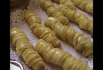 * mélangez la farine , la margarine fondue et refroidie , bien frotter entre les mains puis ajoutez le sel , mouillez avec l'eau de fleurs d'oranger , ajoutez la quantité d'eau nécessaire et pétrissez le tout pour obtenir une pâte consistante , couvrez-la avec du papier film et laissez reposer pendant 10 minutes