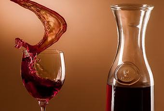 Du vin rouge dans un verre et un pichet, du pain et du camembert fixés sur une table à roulettes, qui est lancée contre un butoir, provoquant le débordement du verre.