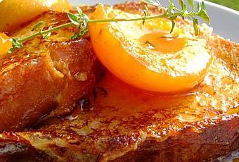 4. Disposer une tranche et demi de brioche perdue dans chaque assiette de service, déposer 4 demi abricots et napper de leur sirop de cuisson. Servir aussitôt.