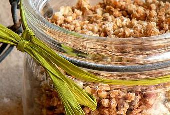 Un muesli croustillant à base de graines germées et de purée de sésame (Tahin) à déguster nature ou avec des fruits séchés (baies de goji, myrtilles, abricots...) au petit-déjeuner , ou à utiliser comme base pour la confection de barres diététiques ou simplement à grignoter pour le plaisir ou à parsemer salades de frutis etr entremets.