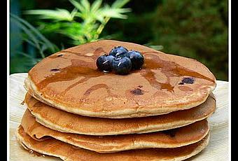 Dans un grand bol, mélanger les ingrédients secs à la cuillère de bois, réserver. Mélanger les ingrédients liquides ensemble ainsi que le zeste de citron et l'incorporer au mélange sec. Fouetter jusqu'à ce que le mélange soit bien lisse. Verser 1/4 à 1/3 tasse de pâte à crêpes dans un poêlon chaud et parsemer de bleuets. Retourner la crêpe quand des bulles apparaissent à la surface. Napper de sirop d'érable. Donne une dizaine de crêpes.