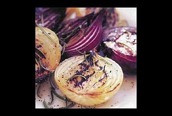 - Couper les oignons en 2 sans les peler. Les mélanger avec 2 cuillerées à soupe d'huile d'olive, le romarin ; saler et poivrer.