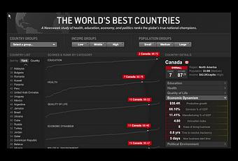 Les canadiens se rappellent sans aucun doute cette fameuse phrase de notre ex premier ministre Jean Chrétien: "Le Canada le plus beau pays du monde" . Il semble, selon newsweek, que nous sommes maintenant le 7e. Application flash intéressante qui nous affiche plusieurs statistiques (Economique, Santé, Politique,...) . Heureux d'apprendre que mon espérance de vie se situe autour de 73 ans, et que nous sommes 2e pays pour la moyenne d'âge de scolarité (16 ans d'étude). Le meilleur pays étant selon ce classement : La Finlande.