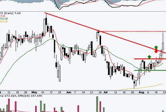 Dépasser les 7.30$, le nouvel objectif tel que mentionné était situer à 8$ soit le sommet antérieur de la fin juin, CSI.TO à pousser une pointe haussière vendredi dernier qui a porter la courbe des prix jusqu’à 7.95$ avant que s’enclenche un recul prise de profits à 0.05¢ de la cible des 8$. Les zones de résistance sont très souvent des zones de ventes court terme qui permette de maximiser les gains, puis de se repositionner plus bas avant la suite de la continuité haussière. Colossus Minerals est définitivement sur une trajectoire haussière qui devrait ramener la courbe des prix court terme à proximité de la zone résistance des 8$. Une consolidation à proximité de la résistance diagonale rouge est une possibilité et si cela arrive, voilà une excellente opportunité d’achats ! Mais il n’est pas dit que le titre va absolument effectuer un repli stratégique, car il a démontré beaucoup de forces haussières lors des 3 dernières séances, par contre les séquences haussières de 3 jours sont très souvent favorables à un repli court terme. Alors, sur repli accumuler ou acheter et sur une continuité haussière court terme sans aucun autre achat, la zone résistance des 8$ est une zone de vente.
