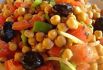 1 grosse boîte de pois chiche - 2 tomates - 1 petit oignon - 2 cs de persil haché - 100 g d'olives noires - 1 cs de vinaigre de cidre -3 cs d'huile d'olive - 1 cc de miel (d'accacia pour moi) - 1 grosse gousse d'ail écrasée - 1 poivron vert moyen.sel et poivre.