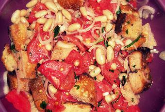 2. Mettre les tomates, l'oignon et les haricots égouttés et rincés dans le saladier.