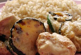 Quand toutes les courgettes sont dorées, baissez le feu sur feu doux. Faites revenir doucement le poulet, il sera ainsi très moelleux.Quand le poulet est cuit sur toutes les faces, ajoutez les courgettes et un yaourt de brebis, laissez mijotez doucement en mélangeant délicatement pour ne pas abîmer les courgettes.