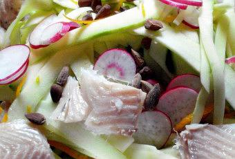 Pour quatre becs en entrée, remplissez votre panier de quatre radis, trois courgettes, deux petits filets de féra fumée (ou de truite fumée pour nos lecteurs non lacustres), une orange, un citron et quelques amandes amères.