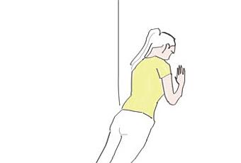 • Debout à 1 mètre du mur, les mains en appui écartées un peu plus large que mes épaules, je me mets sur la pointe des pieds jambes légèrement fléchies.