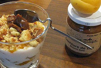 Dans une verrine deposer des miettes de palets breton, de la compotée d'abricots, de la confiture de lait et enfin 2CàS de fromage blanc. Renouveller l'opération en terminant par des miettes de gâteau et un peu de confiture de lait. Procéder de la même façon pour réaliser la seconde verrine.