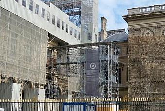 Il y a quelques jours, en passant en bus près du Louvre, côté Seine, j'ai vu une partie du musée recouvert par un énorme échafaudage. Je me suis dit tout d'abord qu'il s'agissait peut-être des travaux du futur Département des arts de l'Islam. En fait il s'agit de la "restauration des couvertures et façades des corps de bâtiment du périmètre de la cour du Sphinx" et de la "restauration de la charpente de l'aile de la Petite Galerie", travaux qui vont durer jusqu'en décembre 2011.