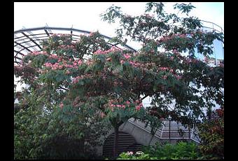 L’albizia est de la famille du mimosa ; ses fleurs sont remarquables : ce sont les étamines que l’on voit, sorte de petit plumeau aux teintes roses, alors que les pétales sont très discrets. Et ses feuilles se ferment à la nuit.