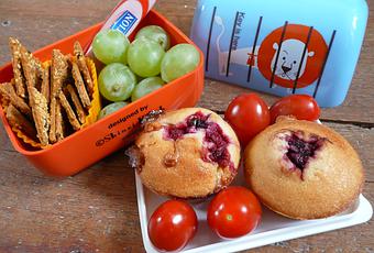 J'avais mis dans ce bento des crakers au chèvre et au poivre, des tomates cerises, des grains de raisin, une petite tablette de chocolat à la fraise et des muffins au chocolat blanc et aux framboises.
