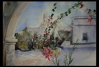 Le jardin d'un menzel à DjerbaJ'aime Djerba, bleue et douce, ses ombrages calmes et sa mer translucide, ses jardins secrets sertis de bougainvillés roses. Une île propice aux techniques de l'aquarelle qui sait si bien rendre la transparence de sa lumière nacrée.
