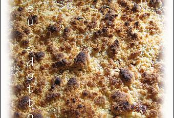 Lorsque la tarte est cuite, la saupoudrer de ce streusel (crumble) et la remettre cuire 10 à 15 min (j'ai mis le grill du four) mais surveiller la dorure pour éviter que ça noircisse trop, et c'est prêt.....