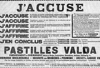 En 1907, Dreyfus est réhabilité depuis juillet 1906. Le publicitaire des pastilles Valda se souvient du "J'accuse" de Zola.