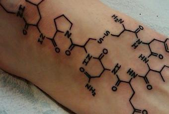 Ceci est la formule de l'Ocytocine. Je vous laisse lire la définition pour comprendre la poésie particulière dont peuvent faire preuve les scientifiques quand ils se font tatouer quelque chose.