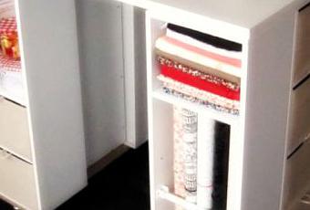 Après avoir trouvé 6 petites tables de nuit à casiers, je les ai assemblées à une planche et mis sur roulette. Il a fallu également recouvrir les boites des casiers de tissu (du lin) pour cacher leur couleur fluo.
