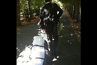 Vous remarquerez qu'il porte avec décontraction sa planche de surf qui fait largement trois fois le poids de sa