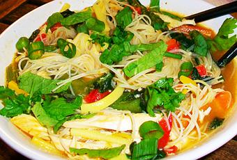 Dans 2 grands bols, dans l’ordre, disposer : un peu de vermicelles de riz, le bouillon et les légumes, les lamelles de poulet, puis parsemer avec les herbes et le piment.