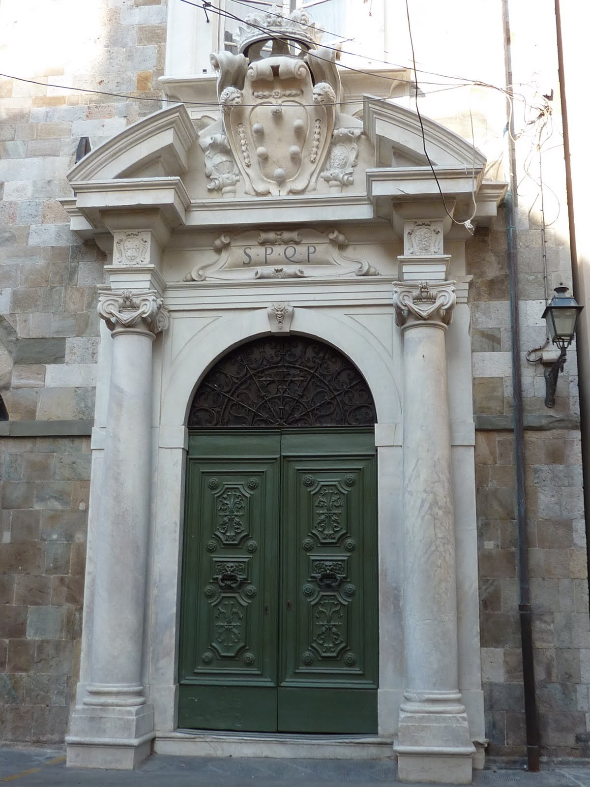A Pise (comme à Florence d'ailleurs), pas de cariatides mais des frontons luxueux aux corniches travaillées, aux tympans ornés de vitraux, de peintures extérieures ou de pierre ouvragée, le tout étant souvent surmonté d'une statue ou d'un blason.