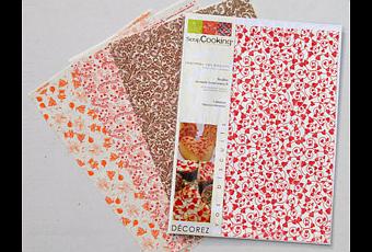 Des feuilles alimentaires originales pour décorer vos gâteaux, très simples d’utilisation. Vous posez vos feuilles de papier sur la plaque, vos biscuits sur la feuille, 10 minutes au four, et le tour est joué, vos réalisations sont imprimées. Une manière de personnaliser vos gâteaux et de donner un air de fête à la plus simple des recettes. Effet garanti ! Vendus par 6 feuilles, motifs différents de fleurs, arabesques…