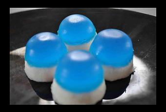 Faites ramollir 5 feuilles de gélatine dans de l’eau puis les incorporer dans 5cl d’eau préalablement portée à ébullition. Y ajouter les 5cl de sirop ainsi que l’édulcorant et le colorant. Mettez le liquide dans des moules à glaçons en silicone, remplir les « trous » à moitié. Faire prendre la gelée quelques minutes au frigo.