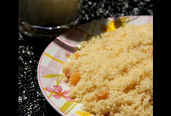 Dresser le couscous en dôme dans un grand plat creux et saupoudrer de cannelle et de sucre. (moi je ne met pas de cannelle)